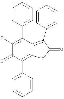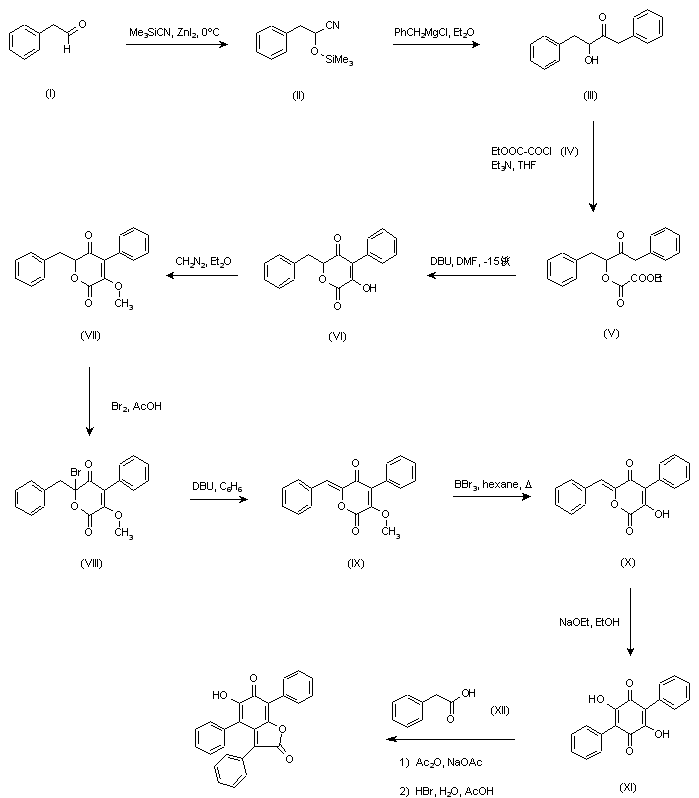 Addition of benzylmagnesium chloride to O-(trimethylsilyl)cyanohydrin (II) (obtained from phenylacetaldehyde (I) and Me3SiCN), led to benzylacyloin (III). Esterification with ethyl oxalyl chloride (IV) in the presence of Et3N afforded oxalate (V), which was cyclized with DBU in cold DMF to provide dihydrogrevillin (VI). This was methylated with ethereal diazomethane to give ether (VII), and then brominated in AcOH. Elimination of the resulting bromide (VIII) by treatment with DBU produced (IX), which was demethylated with BBr3 to afford grevillin (X). This compound was isomerized with NaOEt in EtOH to produce terphenyl quinone (XI). Finally, Perkin reaction with phenylacetic acid (XII), followed by treatment with HBr furnished the title compound.