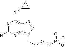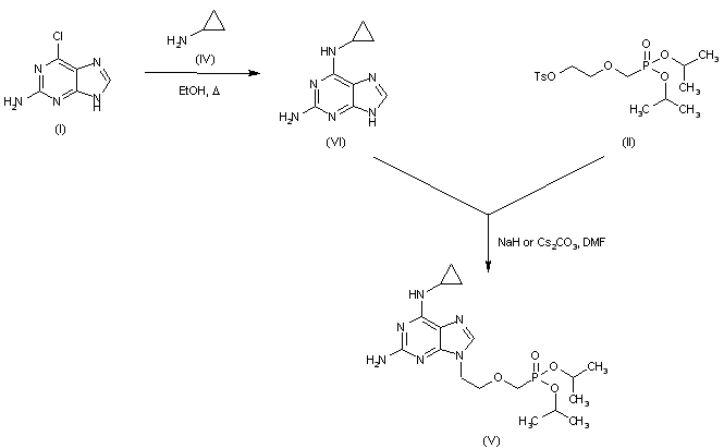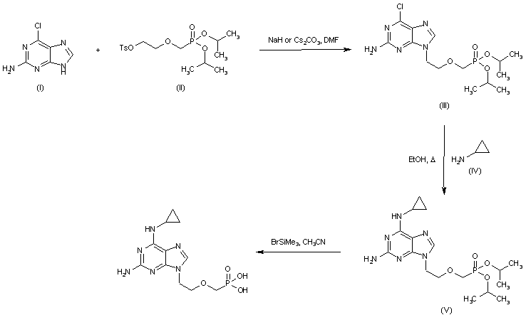 | 合成路线图解说明: Alkylation of 2-amino-6-chloropurine (I) with tosylate (II) afforded the phosphonomethoxyethyl purine (III). Subsequent displacement of the chloro atom of (III) by cyclopropylamine (IV) furnished diaminopurine (V). The isopropyl protecting groups of (IV) were finally cleaved by treatment with bromotrimethylsilane. |