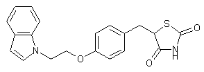The target compound was obtained by several related ways. Indolylethanol (III) was either prepared by alkylation of indole (I) with methyl bromoacetate, followed by reduction of the resulting indolylacetate (II) with LiAlH4 or by alkylation of (I) with 2-bromoethanol. Alkylation of (III) with 4-fluorobenzaldehyde (IV) in the presence of NaH or condensation with 4-hydroxybenzaldehyde (V) under Mitsunobu conditions provided ether (VII). Alternatively, (VII) was prepared by alkylation of indole (I) with 4-(bromoethoxy)benzaldehyde (VI). Then, Knoevenagel condensation of aldehyde (VII) with 2,4-thiazolidinedione (VIII) in the presence of piperidinium benzoate in refluxing toluene with azeotropic removal of water yielded benzylidene compound (IX). Reduction of the olefinic double bond by either hydrogenation in the presence of an excess of Pd/C or by chemical reduction with Mg in MeOH provided the target benzyl compound. Alternatively, indolylethanol (III) was condensed with hydroxybenzyl compound (X) in the presence of tributyl phosphine and 1,1'-(azodicarbonyl)dipiperidine (ADDP) in benzene to give (XI), which was finally deprotected by hydrogenation in the presence of an excess of Pd/C in dioxan.