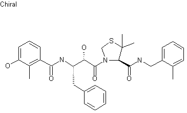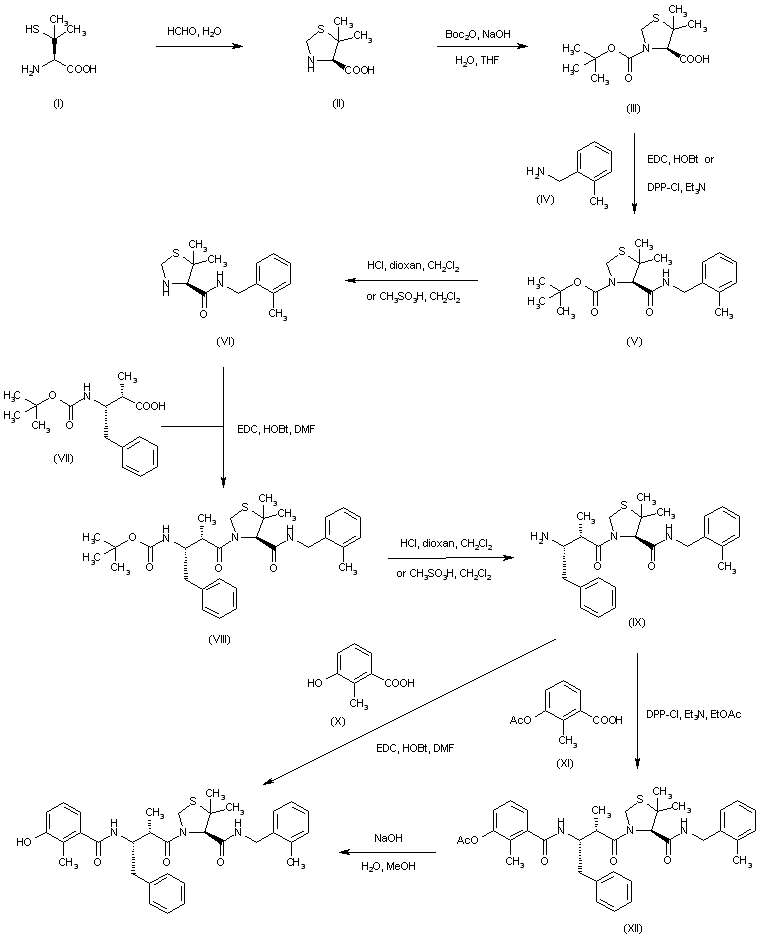 Treatment of penicillamine (I) with formaldehyde produced thiazolidine (II), which was then protected with Boc2O to give carbamate (III). Coupling of (III) with 2-methylbenzylamine (IV) by means of either diphenylphosphoryl chloride (DPPCl), 1-ethyl-3-(3-dimethylaminopropyl)carbodiimide-HCl (EDC) or dicyclohexylcarbodiimide (DCC) afforded the corresponding amide (V). After acid cleavage of the Boc group of (V), the deprotected thiazolidine (VI) was coupled with N-Boc-(S,S)-3-amino-2-hydroxy-4-phenylbutyric acid (VII) using EDC to give diamide (VIII). Further acid deprotection of the Boc group of (VIII) yielded (IX). This was finally coupled with 3-hydroxy-2-methylbenzoic acid (X) to furnish the title compound. Alternatively, amine (IX) was coupled with 3-acetoxy-2-methylbenzoic acid (XI) to afford (XII), which was then deacetylated using NaOH in MeOH.