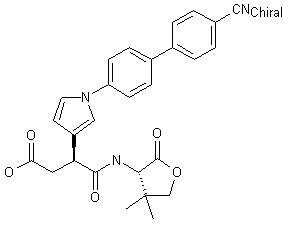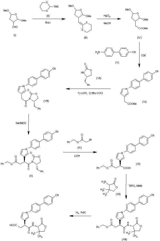 The reaction of 2,5-dimethoxytetrahydrofuran-3-carbaldehyde (I) with 2-(trimethylsilyl)-1,3-dithiane (II) by means of BuLi in THF gives the expected condensation product (III), which is treated with HgCl2 and methanol in THF/water yielding 2-(2,5-dimethoxytetrahydrofuran-3-yl)acetic acid methyl ester (IV). The cyclization of (IV) with 4'-aminobiphenyl-4-carbonitrile (V) by means of CDE in hot trifluorocetic acid affords the biphenylylpyrrole (VI), which is hydrolyzed with LiOH and condensed with the chiral auxiliary 4(S)- benzyloxazolidin-2-one (VII) by means of pivaloyl chloride, BuLi and TEA in THF giving the acylated thiazolidine (VIII). The stereocontrolled reaction of (VIII) with benzyl bromoacetate (IX) by means of sodium hexamethyldisylazane (NaHMDS) in THF yields the succinamic ester (X), which is hydrolyzed with LiOH in THF/water to afford the succinic acid monoester (XI). The amidation of (XI) with 3(S)-amino-4,4-dimethyltetrahydrofuran-2-one (XII) by means of TBTU and NMM in DMF provides the succinamic ester derivative (XIII), which is debenzylated by hydrogenation with H2 over Pd/C in methanol.