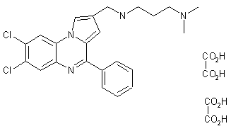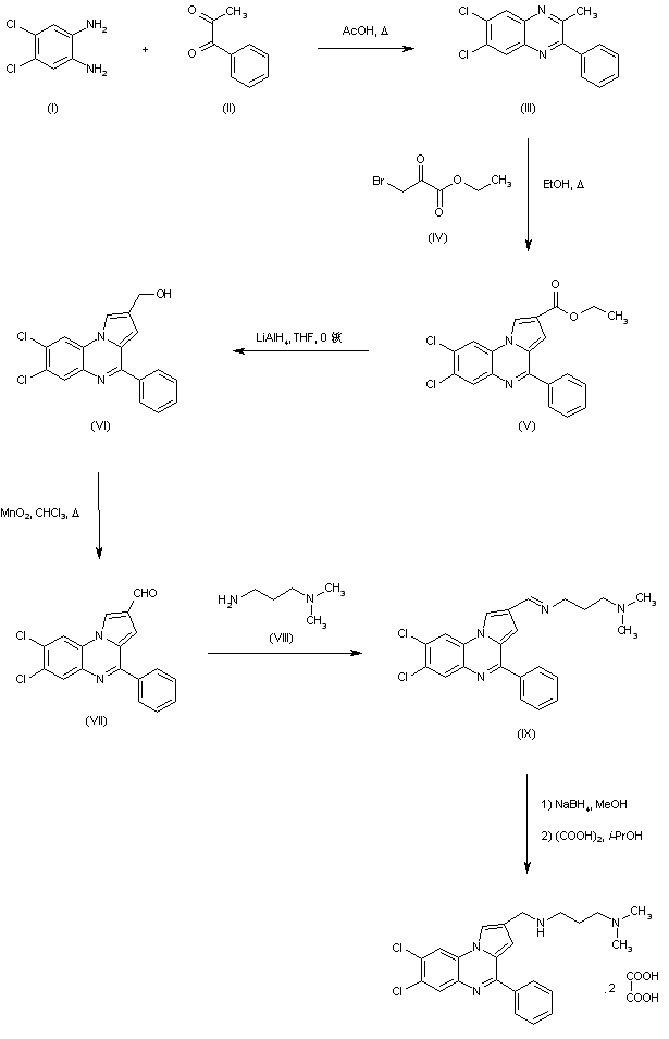 Condensation of 4,5-dichloro-1,2-phenylenediamine (I) with 1-phenyl-1,2-propanedione (II) in boiling AcOH provided quinoxaline (III). Subsequent reaction of (III) with ethyl bromopyruvate (IV) led to the pyrroloquinoxaline (V). After reduction of the ester group of (V) to alcohol (VI) with LiAlH4, further oxidation with MnO2 produced aldehyde (VII). This was condensed with boiling 3-(dimethylamino)propylamine (VIII), and the resulting imine (IX) was finally reduced to the target amine with NaBH4 in MeOH. The title compound was finally converted to the dioxalate salt upon treatment with oxalic acid in isopropanol.