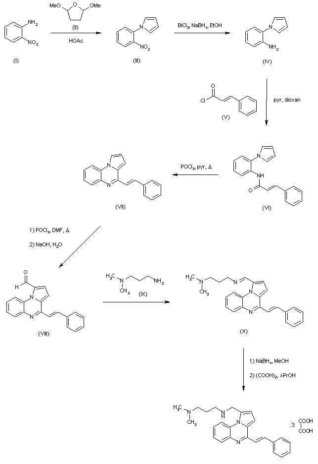 The N-arylpyrrole (III) was prepared by the Clauson-Kaas reaction of 2-nitroaniline (I) with 2,5-dimethoxytetrahydrofuran (II) in AcOH under microwave irradiation. Subsequent reduction of the nitro group of (III) using BiCl3 and NaBH4 provided aniline (IV), which was condensed with cinnamoyl chloride (V) in the presence of pyridine to give the corresponding amide (VI). Cyclization of (VI) using POCl3 and pyridine produced the pyrroloquinoxaline (VII), and further Vilsmeier-Haack formylation gave aldehyde (VIII). This was condensed with boiling 3-(dimethylamino)propylamine (IX), and the resulting imine (X) was finally reduced to the target amine with NaBH4 in MeOH. The title compound was finally converted to the trioxalate salt upon treatment with oxalic acid in isopropanol.