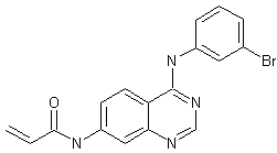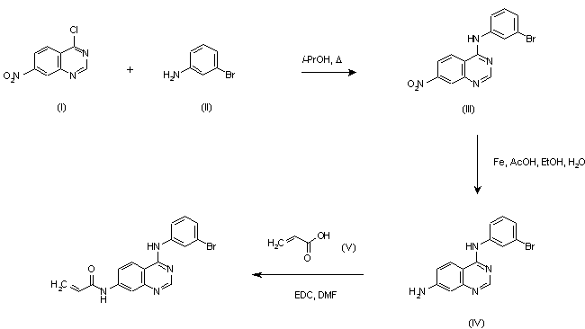 Coupling of chloroquinazoline (I) with 3-bromoaniline (II) in refluxing isopropanol yielded anilinoquinazoline (III). The nitro group was then reduced with Fe dust and AcOH in aqueous ethanol to give amine (IV). Finally, condensation with acrylic acid (V) using 1-(3-dimethylaminopropyl)-3-ethylcarbodiimide.HCl (EDC) in DMF provided the target acrylamide.