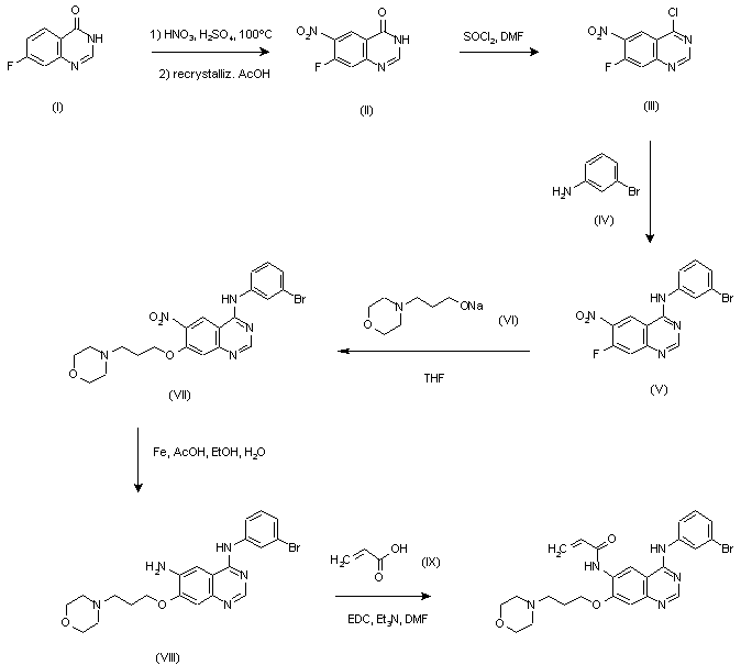 Nitration of quinazolinone (I) with fuming HNO3 in H2SO4 at 100 C gave a mixture of 6-nitro and 8-nitroquinazolines, from which the desired 6-isomer was isolated by recrystallization from AcOH. Subsequent treatment with refluxing SOCl2 and a catalytic amount of DMF gave chloride (III), which was condensed with 3-bromoaniline (IV) in isopropanol to afford anilinoquinazoline (V). Reaction with sodium alkoxide (VI) in refluxing THF provided ether (VII). Then, the nitro group was reduced with Fe dust and AcOH in aqueous ethanol to give amine (VIII). Finally, condensation with acrylic acid (X) using 1-(3-dimethylaminopropyl)-3-ethylcarbodiimide.HCl (EDC) in DMF yielded the target acrylamide.