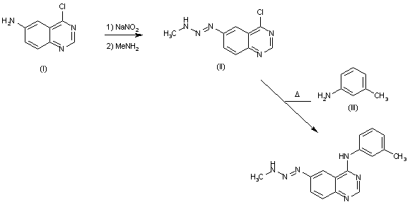 Arylamine (I) is converted into the corresponding methyltriazene (II) by formation of the corresponding diazonium salt with NaNO2 in HCl/H2O, followed by reaction with methylamine. Finally, the target compound is obtained by coupling of (II) with the corresponding amine in refluxing isopropanol.