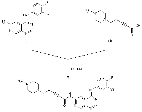 The title amide was prepared by coupling of 6-amino-4-(3-chloro-4-fluorophenylamino)pyrido[3,4-d]pyrimidine (I) with 5-(4-methyl-1-piperazinyl)-2-pentynoic acid (II) in the presence of EDC.