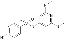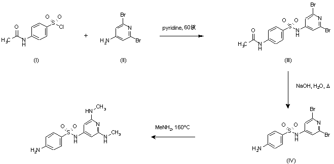 Condensation of 4-acetamidobenzenesulfonyl chloride (I) with 4-amino-2,6-dibromopyridine (II) in pyridine at 60 C afforded sulfonamide (III). The acetamido group was then hydrolyzed in refluxing 1 N NaOH to give (IV). Finally, substitution of both bromine atoms for methylamino groups was carried out by heating with liquid MeNH2 at 160 C in an autoclave.