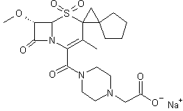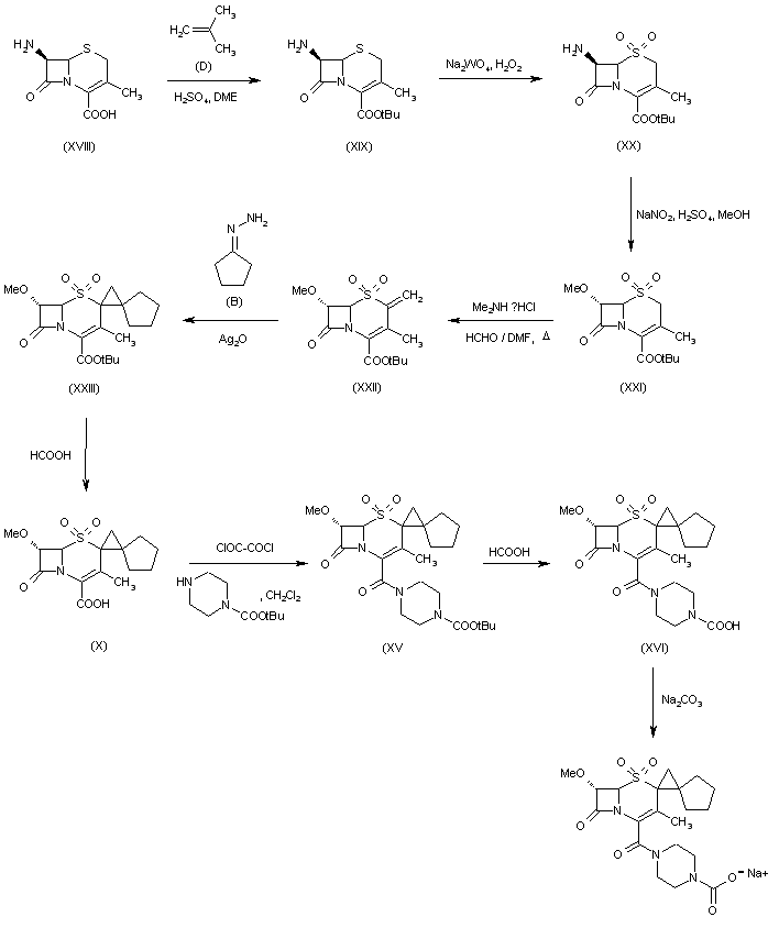 1) Treatment of 6-azopenicillanate (I) with boron trifluoroetherate in a mixture of methanol and methylene chloride gives 6alpha-methoxy penicillanate (II), which on oxidation with peracetic acid gives the corresponding 1beta-oxide (III). Ring opening of the oxide (III) by heating with 2-mercaptohenzothiazole in toluene gives the intermediate (IV), which on cyclization with bromine in methylene chloride gives 2beta-bromomethyl penicillanate (V). Rearrangement of (V) with pyridine in dimethyl sulfoxide gives the cephem intermediate (VI). The sulfone derivative (VII) is obtained by oxidizing (VI) with peracetic acid in methylene chloride. Introduction of the double bound at C-2 position of the sulfone (VII) is achieved by heating with dimethylamine hydrochloride in a mixture of tert-BuOH methylene chloride and formaldehyde. Reaction of the intermediate (VIII) with diazo cyclopentane, generated in situ by treatment of cyclopentyl hydrazono with silver (I) oxide, gives 2,2,2-tricholoroethyl-7alpha-methoxy-2-spiro-(2'-spirocyclopentyl)cyclopropyl-3-methyl-3-cephem-4-carboxylate-1,1-dioxide (IX). Removal of the trichloroethyl group by treatment with Zn/glacial acetic acid gives the corresponding acid (X). Reaction of the acid (X) with oxalyl chloride followed by treatment with 4-tert-butoxycarbonyl piperidine in methylene chloride gives the intermediate (XV). Hydrolysis of the tert-butyl ester with formic acid gives the free acid (XVI). Treatment with sodium carbonate in water gives the corresponding sodium salt of Syn-1396 (XVII).