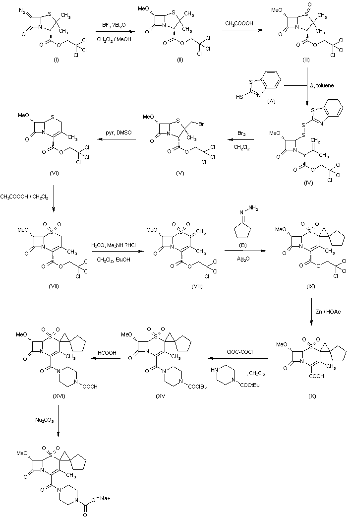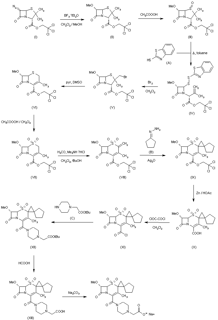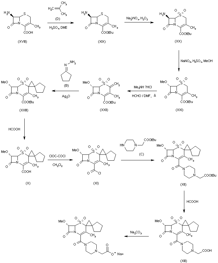 1) Treatment of 6-azopenicillanate (I) with boron trifluoroetherate in a mixture of methanol and methylene chloride gives 6alpha-methoxy penicillanate (II), which on oxidation with peracetic acid gives the corresponding 1beta-oxide (III). Ring opening of the oxide (III) by heating with 2-mercaptohenzothiazole in toluene gives the intermediate (IV), which on cyclization with bromine in methylene chloride gives 2beta-bromomethyl penicillanate (V). Rearrangement of (V) with pyridine in dimethyl sulfoxide gives the cephem intermediate (VI). The sulfone derivative (VII) is obtained by oxidizing (VI) with peracetic acid in methylene chloride. Introduction of the double bound at C-2 position of the sulfone (VII) is achieved by heating with dimethylamine hydrochloride in a mixture of tert-BuOH methylene chloride and formaldehyde. Reaction of the intermediate (VIII) with diazo cyclopentane, generated in situ by treatment of cyclopentyl hydrazono with silver (I) oxide, gives 2,2,2-tricholoroethyl-7alpha-methoxy-2-spiro-(2'-spirocyclopentyl)cyclopropyl-3-methyl-3-cephem-4-carboxylate-1,1-dioxide (IX). Removal of the trichloroethyl group by treatment with Zn/glacial acetic acid gives the corresponding acid (X). Reaction of the acid (X) with oxalyl chloride in methylene chloride gives the acid chloride (XI), which is condensed with 4-(1-butoxycarbonylmethyl)piperazine to afford the product (XII). Deprotection of the tert-butyl group with formic acid gives the free acid (XIII). Finally, this compound is converted into the sodium salt (XIV) of Syn-1390 by treatment with sodium carbonate in water.
