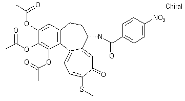 Thiocolchicine (II) was prepared from colchicine (I) by treatment with sodium methylthiolate. Then, hydrolysis of acetamide group with methanolic HCl afforded deacetyl thiocolchicine (III). Subsequent acylation with p-nitrobenzoyl chloride (IV) in the presence of pyridine provided amide (V), which was demethylated with excess BBr3 to give the corresponding triphenol (VI). Finally, esterification with acetyl chloride in the presence of pyridine and 4-(dimethylamino)pyridine furnished the target triacetate.
