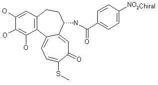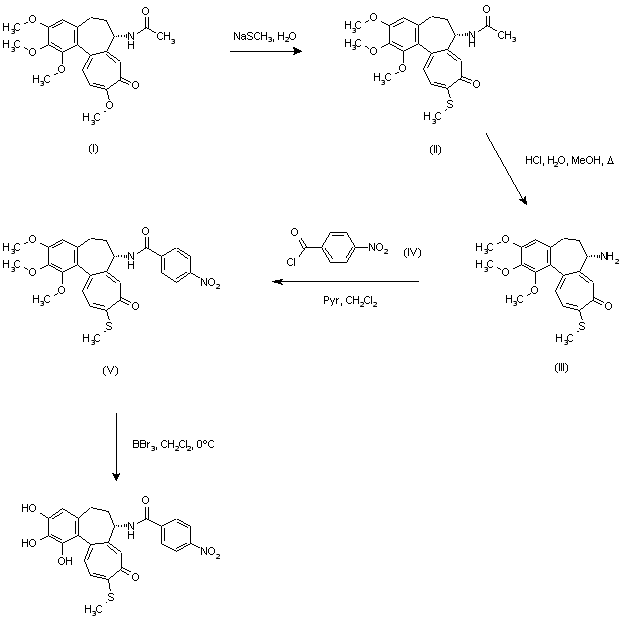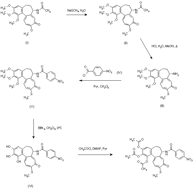 Thiocolchicine (II) was prepared from colchicine (I) by treatment with sodium methylthiolate. Then, hydrolysis of acetamide group with methanolic HCl afforded deacetyl thiocolchicine (III). Subsequent acylation with p-nitrobenzoyl chloride (IV) in the presence of pyridine provided amide (V), which was demethylated with excess BBr3 to give the corresponding triphenol.