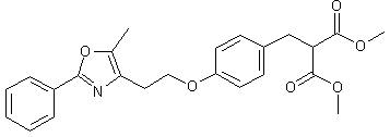 Acetylation of N-benzoylaspartic acid beta-methyl ester (I) with acetic anhydride and subsequent decarboxylation gave the 3-benzoylamino-4-oxovalerate (II). The methyl oxazolylacetate (III) was prepared by cyclization of 4-oxovalerate (II) in the presence of Ac2O. Ester (III) was then reduced to alcohol (IV) with LiBH4 and further converted to mesylate (V) with methanesulfonyl chloride and Et3N. Coupling between mesylate (V) and 4-hydroxybenzaldehyde (VI) gave ether (VII). Knoevenagel condensation of (VII) with dimethyl malonate using piperidine acetate produced the benzylidene malonate (VIII). Finally, catalytic hydrogenation with Pd/C furnished the title compound.