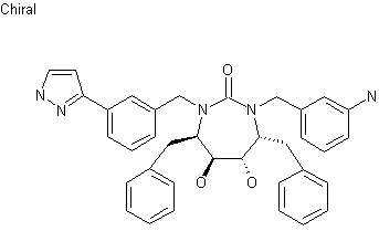 Diol (I) was protected as the bis(methoxymethyl) ether (III) by reaction with methoxymethyl bromide (II) in the presence of diisopropyl ethylamine in DMF, and then, the carbobenzoxy groups of (III) were removed by hydrogenolysis in the presence of Pd/C to afford diamine (IV). Subsequent treatment of (IV) with carbonyl diimidazole (CDI) and pyridine provided the cyclic urea (V). Alkylation of (V) with m-iodobenzyl bromide (VI) in the presence of NaH in DMF provided the bis(iodobenzyl) diazepinone (VII). The title compound was then obtained by Suzuki coupling of (VII) with the protected pyrazolylboronic acid (VIII) in the presence of Pd(PPh3)4 and K2CO3 to furnish the bis(pyrazolylbenzyl) derivative (IX), followed by deprotection of the (trimethylsilyl)ethoxymethyl groups upon treatment with HCl in dioxan-methanol.