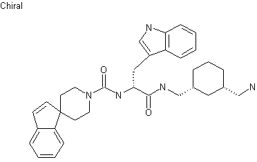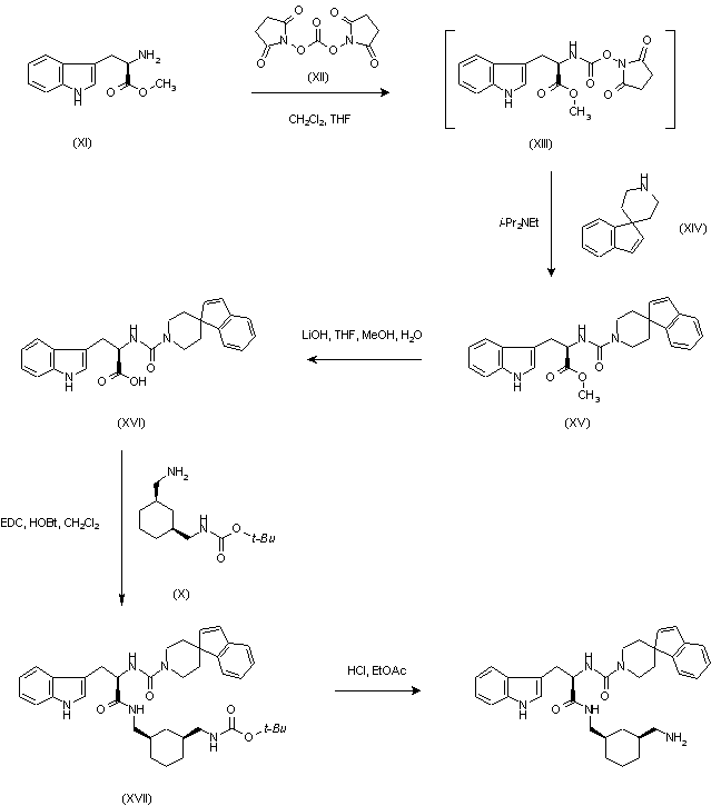 Treatment of D-tryptophan methyl ester (XI) with N,N'-disuccinimidyl carbonate (XII) gave the intermediate succinimidyl carbamate (XIII), which was subsequently converted to urea (XV) upon reaction with spiro(indene-1,4'-piperidine) (XIV). Saponification of the ester function of (XV) with LiOH afforded the carboxylic acid (XVI), and this was then coupled with the Boc-protected chiral diamine (X) using EDC and HOBt. The resulting precursor (XVII) was finally deprotected with HCl in EtOAc to provide the title compound.