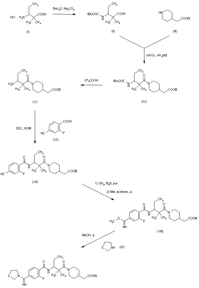 Protection of beta-alanine derivative (I) with di-tert-butyl dicarbonate afforded the tert-butyl carbamate (II). This was condensed with ethyl piperidine-4-acetate (III) using O-(7-azabenzotriazol-1-yl)-1,1,3,3-tetramethyuronium hexafluorophosphate (HATU) and diisopropyl ethylamine to give amide (IV). Subsequent Boc deprotection of (IV) with trifluoroacetic acid provided amine (V), which was coupled with 2-fluoro-4-cyanobenzoic acid (VI) in the presence of 1-ethyl-3-(3-dimethylaminopropyl)carbodiimide and 1-hydroxybenzotriazole yielding (VII). Treatment of the resulting cyanobenzamide (VII) with SH2 and Et3N produced the corresponding thioamide, which was S-alkylated with MeI to give (VIII). Finally, displacement of the methylthio group of (VIII) with thiazolidine (IX) furnished the corresponding amidine.