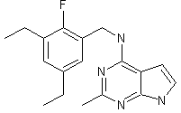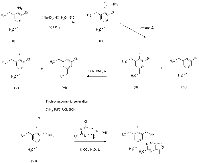 Aniline (I) was diazotized, and then precipitated as the hexafluorophosphate salt (II). Refluxing in p-xylene afforded an inseparable mixture of fluorinated (III) and nonfluorinated (IV) products. This mixture was treated with CuCN to furnish a mixture of nitriles, from which the major fluorinated nitrile (V) was separated by silica gel chromatography. Subsequent reduction of nitrile (V) by catalytic hydrogenation in the presence of Pd/C provided benzylamine (VII). Finally, displacement of the 4-chloro group of pyrrolopyrimidine (VIII) with (VII) in the presence of K2CO3 in boiling water yielded the target compound.