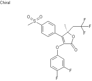Alkylation of 2-(S)-tert-butyl-5-(S)-methyl-1,3-dioxolan-4-one (I) with 1,1,1-trifluoro-2-iodoethane (II) in the presence of LDA in THF at -72 C provided trifluoroethyl compound (III). Condensation of (III) with 4-(methylthio)phenyllithium (IV), prepared from 4-bromothioanisole and BuLi, gave (V), which was hydrolyzed with p-toluenesulfonic acid in boiling water to afford ketone (VI). Subsequent oxidation of sulfide group with KHSO5 (Oxone(R)) in the presence of Oct3NMeCl (Aliquat 336(R)) produced sulfone (VII). Esterification of (VII) with chloroacetic acid using 1-cyclohexyl-3-(2-morpholinoethyl)carbodiimide methyl-p-toluenesulfonate (CMC) as the condensing agent provided chloroacetate (VIII). Finally, condensation with 3,4-difluorophenol (IX) in the presence of DBU in acetonitrile gave the intermediate ether (X), which cyclized to produce the target furanone.
