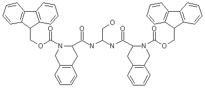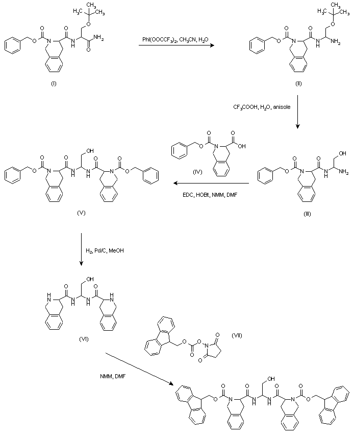 | 合成路线图解说明: The Hofmann degradation of dipeptide amide (I) using bis(trifluoroacetoxy)iodobenzene in aqueous acetonitrile yielded the geminal diamine derivative (II). After deprotection of the tert-butyl group of (II) with aqueous trifluoroacetic acid containig anisole, the resulting aminoalcohol (III) was coupled with N-(benzyloxycarbonyl) tetrahydroisoquinoline-3-carboxylic acid (IV) by means of 1-ethyl-3-(3-dimethylaminopropyl)carbodiimide-HCl (EDC) and 1-hydroxy- benzotriazole (HOBt) to afford the geminal diamide (V). The catalytic hydrogenolysis of both benzyloxycarbonyl groups of (V) was carried out in the presence of Pd/C, and the deprotected diamino compound (VI) was finally converted to the bis(Fmoc) derivative by coupling with N-(9-fluorenylmethoxycarbonyloxy)succinimide (VII) in the presence of N-methylmorpholine. |