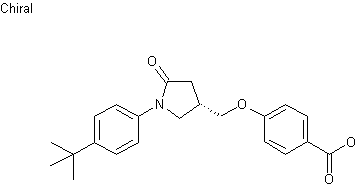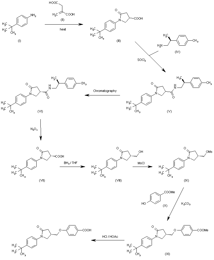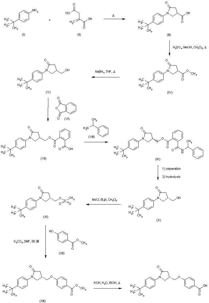 The Michael addition of 4-tert-butylaniline (I) with 2-methylenesuccinic acid (II) followed by cyclization gives racemic 1-(4-tert-butylphenyl)-5-oxopyrrolidine-3-carboxylic acid (III) (1), which is treated with SOCl2 and condensed with (S)(-)-1-(4-methylphenyl)ethylamine (IV) to yield a diastereomeric mixture of amides (V). The resolution of (V) by silicagel chromatography affords the (S,S)-diastereomer (VI), which is treated with N2O4 and NaOAc in CCl4 to provide 1-(4-tert-butylphenyl)-5-oxopyrrolidine-3(S)-carboxylic acid (VII). The reduction of (VII) with BH3/THF in dichloromethane gives the corresponding carbinol (VIII), which is treated with MsCl and TEA in dichloromethane to yield the mesylate (IX). The condensation of (IX) with 4-hydroxybenzoic acid methyl ester (X) by means of K2CO3 in DMF affords the corresponding phenyl ether (XI), which is finally hydrolyzed with HCl/AcOH to furnish the target compound.