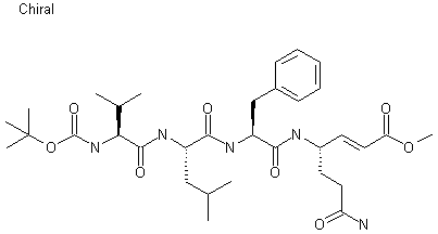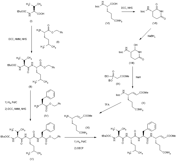 By deprotection of tripeptide (V) (hydrogenolysis of the benzyl group with H2 over Pd/C) followed by condensation with amino acid ester (XI) by means of diethyl cyanophosphonate (DECP) in DMF. The intermediates (V) and (XI) have been obtained as follows: 1.- The condensation of N-(tert-butoxycarbonyl)-L-valine (I) with L-leucine benzyl ester (II) by means of DCC, NMM and NHS gives the dipeptide (III), which is condensed with L-phenylalanine benzyl ester (IV) by first debenzylation and condensation as before yielding the desired tripeptide (V). 2.- The cyclization of N-(tert-butoxycarbonyl)-L-glutamine (VI) by means of DCC and NHS gives the glutarimide (VII), which is partially reduced with NaBH4 to the cyclic Boc-glutaminal (VIII). The condensation of (VIII) with the phosphonate (IX) by means of NaH in THF affords the unsaturated protected aminoester (X), which is finally deprotected with trifluoroacetic acid in dichloromethane providing the desired amino acid ester (XI).