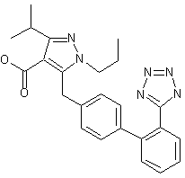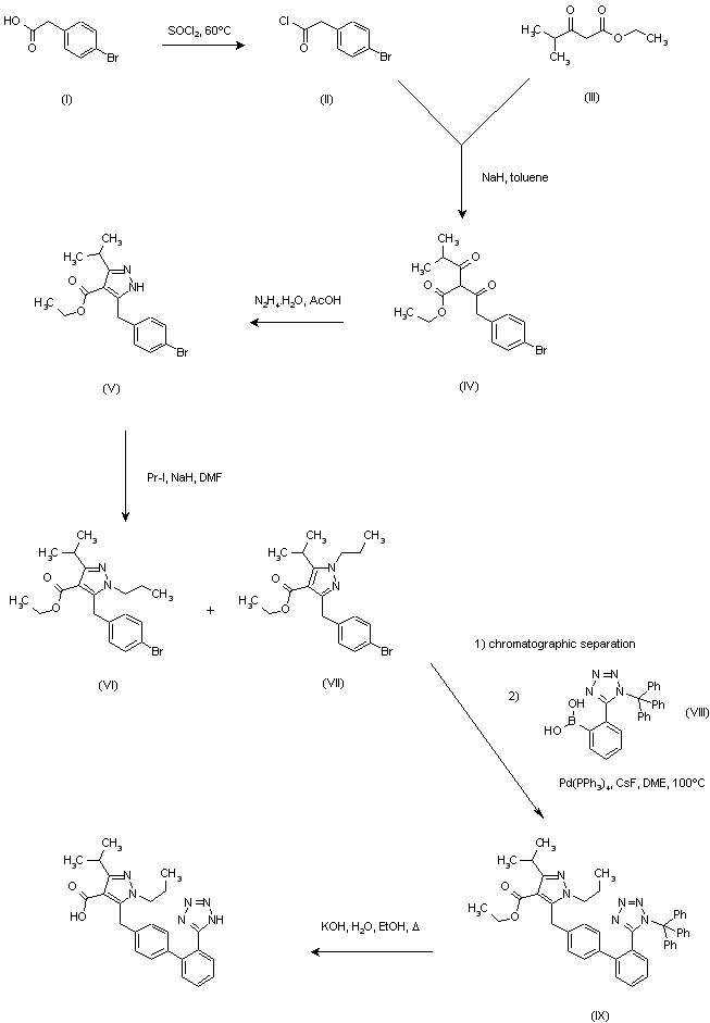 Acid chloride (II) (prepared from 4-bromophenylacetic acid (I) and SOCl2), was condensed with ethyl isobutyrylacetate (III) in the presence of NaH in toluene to yield diketoester (IV). Further reaction of (IV) with hydrazine monohydrate in AcOH gave pyrazole (V). The subsequent N-alkylation of (V) with propyl iodide and NaH provided a 3:1 mixture of regioisomers (VI) and (VII), which were separated by silica gel chromatography. The major isomer (VI) was coupled with arylboronic acid (VIII) in the presence of CsF and Pd(PPh3)4 to provide biphenyl compound (IX). The title compound was then obtained by simultaneous cleavage of the ethyl ester and the N-trityl group on heating with hydroethanolic KOH.
