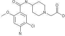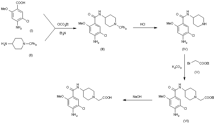 The condensation of 4-amino-5-chloro-2-methoxybenzoic acid (I) with 4-amino-1-(triphenylmethyl)piperidine (II) by means of ethyl chloroformate and triethylamine in THF gives the corresponding amide (III), which is deprotected with HCl in actone yielding 4-amino-5-chloro-2-methoxy-N-(4-piperidyl)benzamide (IV). The condensation of (IV) with ethyl bromoacetate (V) by means of K2CO3 in DMF affords the substituted acetate (VI), which is finally saponified with NaOH in methanol.