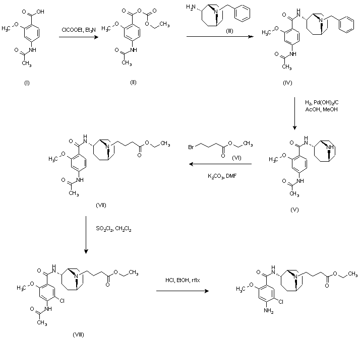 4-Acetylamino-2-methoxybenzoic acid (I) was treated with ethyl chloroformate and triethylamine in cold THF, and the intermediate mixed anhydride (II) was then condensed with endo-9-benzyl-9-azabicyclo [3.3.1]nonan-3-amine (III) to yield amide (IV). Hydrogenolysis of the benzyl group in the presence of Pearlman's catalyst provided secondary amine (V), which was alkylated with ethyl 4-bromobutyrate (VI) to give (VII). Aromatic chlorination with sulfuryl chloride at position 5 afforded (VIII) and, then, selective acetamide hydrolysis with 20% HCl in refluxing ethanol gave the target compound.