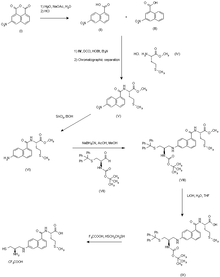 Treatment of 3-nitro-1,8-naphthalic anhydride (I) with mercuric oxide and aqueous sodium acetate, and then with refluxing concentrated HCl provided a mixture of decarboxylation products (II) and (III). Condensation of this mixture with L-methionine methyl ester (IV) in the presence of dicyclohexylcarbodiimide and 1-hydroxybenzotriazole, followed by chromatographic separation of isomers, yielded the desired 6-nitronaphthalenecarboxamide (V). Further reduction of the nitro group with SnCl2 in ethanol gave amine (VI), which was reductively condensed with S-triphenylmethyl-N-Boc-cysteinal (VII) in the presence of sodium cyanoborohydride, acetic acid, and molecular sieves to afford (VIII). Then, hydrolysis of methyl ester with lithium hydroxide in THF-water gave acid (IX), and finally, deprotection of trityl and tert-butoxycarbonyl groups with an excess of trifluoroacetic acid in the presence of ethanedithiol provided the title compound as the trifluoroacetate salt.
