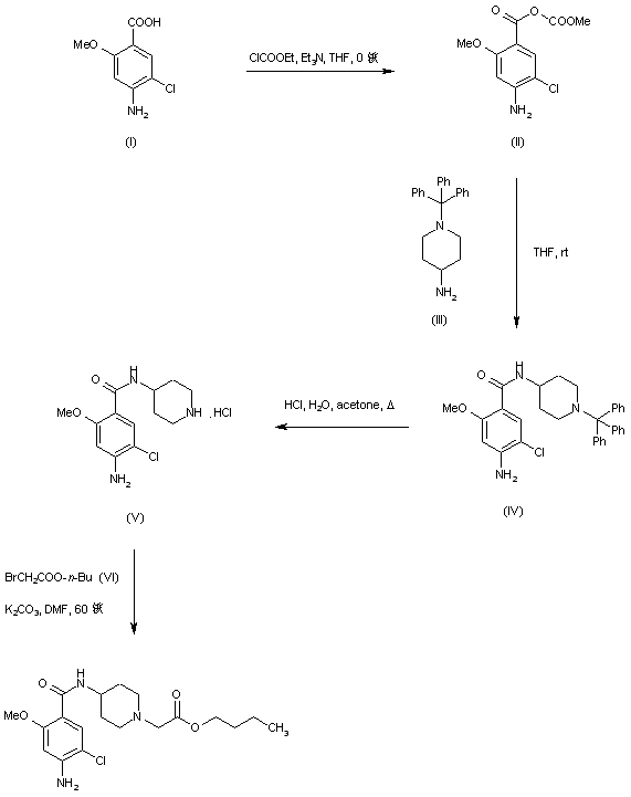 4-Amino-5-chloro-2-methoxybenzoic acid (I) was converted to the mixed anhydride (II) upon treatment with ethyl chloroformate and Et3N. Subsequent coupling of (II) with 4-amino-1-tritylpiperidine (III) afforded amide (IV). The trityl group of (IV) was then removed by acidic treatment to give piperidine (V). Finally, alkylation of (V) with butyl bromoacetate (VI) furnished the title compound.