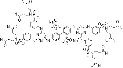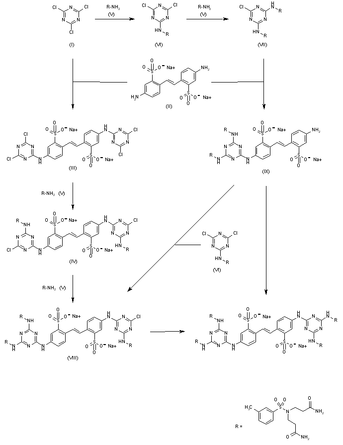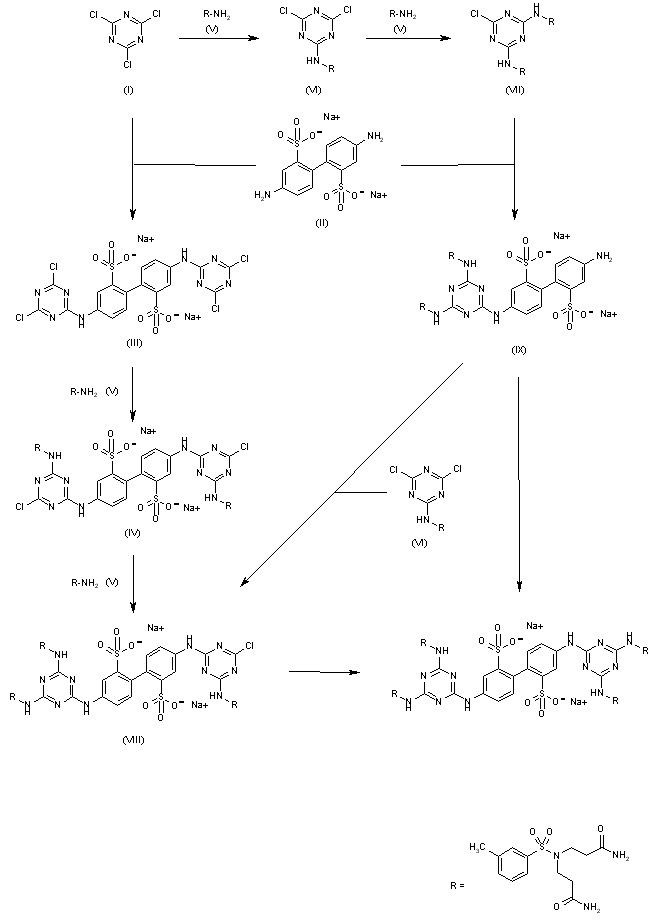 As shown in Scheme 26628701a, both pathways are based on the stepwise replacement of the chlorine atoms in cyanuric chloride (I) with amines under increasingly harsher conditions. For example, the first chlorine atom was exchanged quite easily with the appropriate amine at 0 C for a few minutes. Exchange of the second chlorine required a reaction temperature of about 50 C for 3 h. Displacement of the third chlorine required still more drastic conditions with temperatures between 100-120 C and for 20-40 h. The stepwise condensation of the diaminobiphenyldisulfonate (II) corresponding to the central core of the inhibitor, with 2 moles of cyanuric chloride yielded the tetrachloro intermediate (III). The latter was transformed to the dichloro derivatives (IV) with the appropriate amine and then to the target compound by adding addition al amine to fill out the periphery of the molecule. These stepwise procedures were carried out in organic-aqueous media at neutral pH. For the alternative pathway, reaction of cyanuric chloride with an amine (VI) at 0 C and then the same amine (VI) at 50 C gave the uncharged synthon (VII). Condensation of the substituted monochlorotriazine (VII) with the aminobiphonyldisulfonate (II) at 100-120 C in dry organic media and in the presence of an amine provided the target compound. The reaction of substituted chlorotriazinea with amines at intermediate stages could be stopped to isolate compounds (VIII) or (IX). These were then used for the synthesis of RSV fusion inhibitors with specific functional groups such as those suitable for photoaffinity and radio labeling experiments. Biotinylated derivatives with spacers or linkers were also prepared from these intermediates for use in surface plasmon resonance studies.