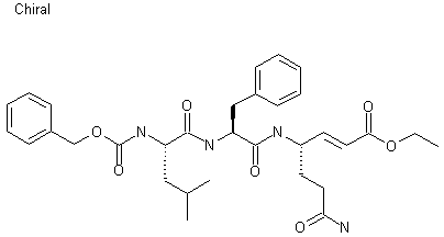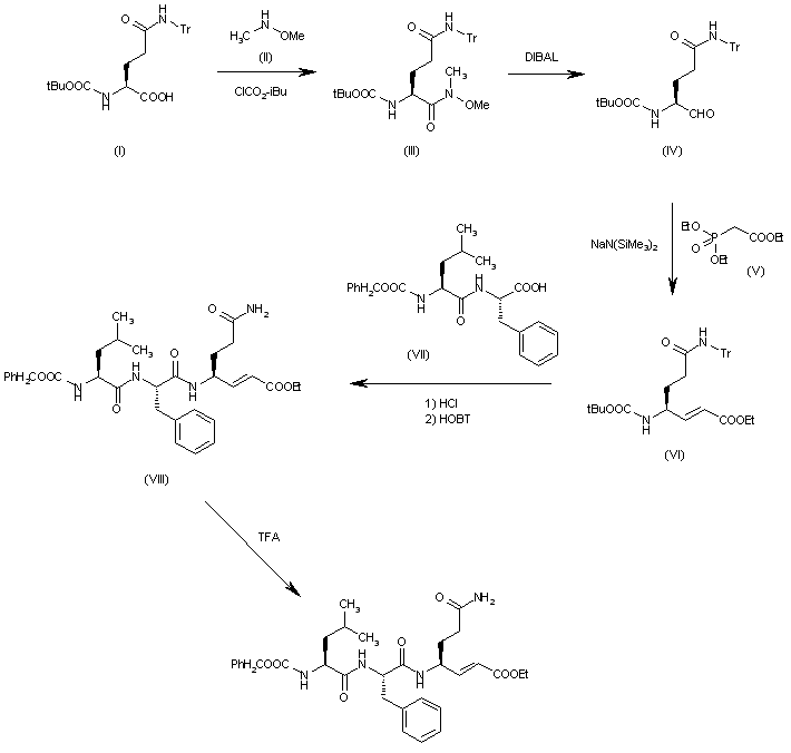 The condensation of the protected L-glutamine (I) with N,O-dimethylhydroxylamine (II) by means of isobutyl chloroformate and NMM in dichloromethane gives the methoxyamide (III), which is reduced with DIBAL in THF to the aldehyde (IV). The condensation of (IV) with phosphonate (V) by means of NaN(SiMe3)2 in THF yields the carbamoylhexenoate (VI), which is selectively deprotected with HCl in dioxane and condensed with the dipeptide (VII) by means of HOBT, NMM and EDC in dichloromethane to afford the tritylated target compound (VIII). Finally, the trityl group of (VIII) is eliminated with TFA and Et3SiH in dichloromethane.