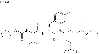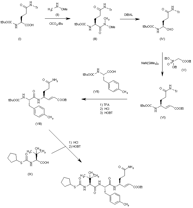 The reaction of the protected L-glutamine (I) with N,O-dimethylhydroxylamine (II) by means of isobutyl chloroformate and NMM in dichloromethane gives the methoxyamide (III), which is reduced with DIBAL in THF yielding the glutaminal (IV). The condensation of (IV) with phosphonate (V) by means of NaN(SiMe3)2 in THF affords the carbamoylhexenoate (VI), which is deprotected with TFA and HCl and condensed with N-(tert-butoxycabonyl)-4-methyl-L-phenylalanine (VII) by means of HOBT, NMM and EDC in dichloromethane to give the dipeptide (VIII), which is finally deprotected with HCl and condensed with N-(cyclopentylsulfanylcarbonyl)-L-tert-leucine (IX) by means of HOBT as before.
