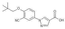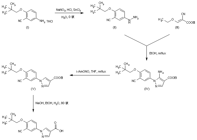 2-Cyano-3-neopentyloxyaniline (I) was diazotized with NaNO2/HCl and then reduced with SnCl2 to give hydrazine (II). The required pyrazole system (IV) was then obtained by condensation of hydrazine (II) with ethyl 2-cyano-3-ethoxyacrylate (III). Deamination of (IV) was achieved by diazotization of the amino group by means of isoamyl nitrite, with concomitant decomposition of the diazonium salt in refluxing THF to yield (V). Finally, saponification of the ethyl ester group of (V) provided the title carboxylic acid.