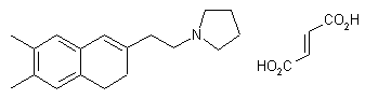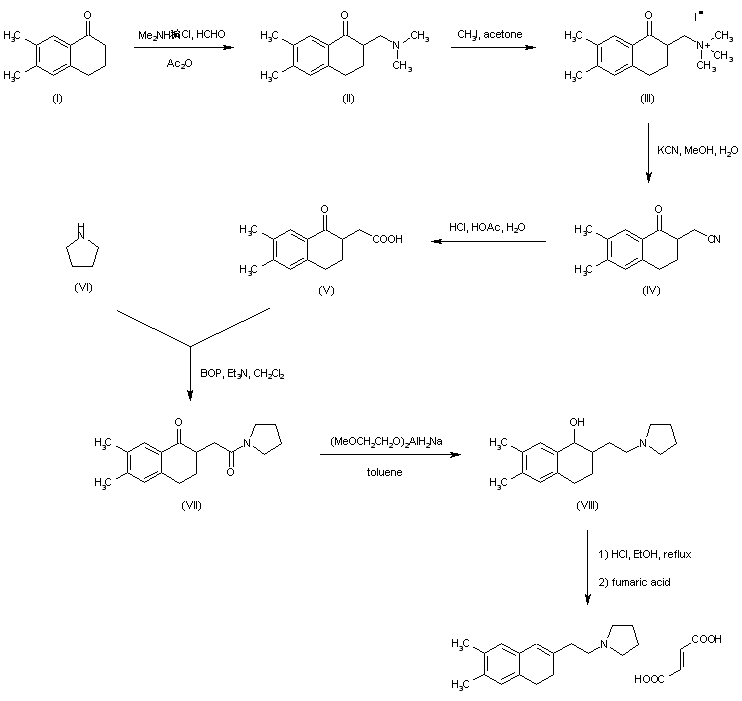Mannich reaction of 6,7-dimethyltetralone (I) with dimethylamine and formaldehyde provided amino ketone (II). Subsequent quaternization of (II) with MeI in acetone gave ammonium salt (III), that was further displaced by KCN yielding nitrile (IV). Acidic hydrolysis of the cyano group of (IV) produced carboxylic acid (V). This was then coupled with pyrrolidine (VI) employing BOP reagent to furnish amide (VII). Reduction of the ketone and amide functions of (VII) by means of vitride?in toluene afforded amino alcohol (VIII). After alcohol (VIII) dehydration with ethanolic HCl, the title compound was isolated as the fumarate salt.