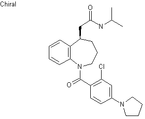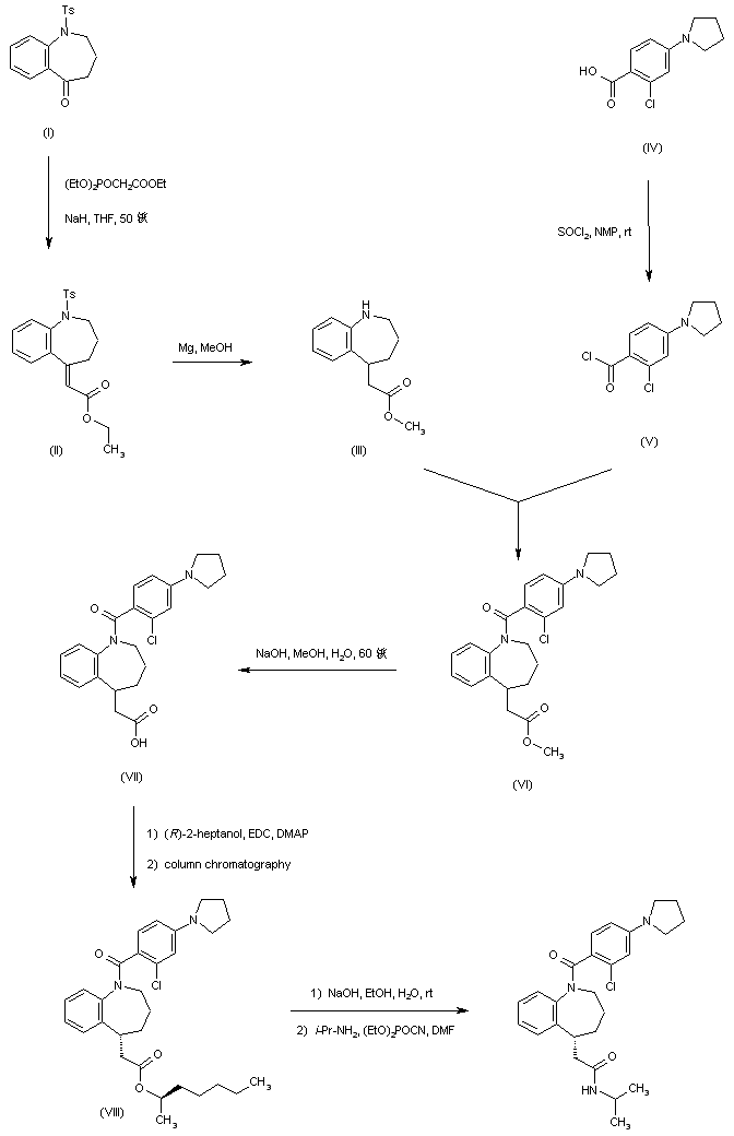 Horner-Emmons condensation of benzazepinone (I) with triethyl phosphonoacetate gave unsaturated ester (II). Subsequent reductive treatment of (II) with Mg in MeOH produced the saturated ester (III) with concomitant cleavage of the tosyl group. 2-Chloro-4-(1-pyrrolidinyl)benzoyl chloride (V) (prepared by reaction of the corresponding carboxylic acid (IV) with SOCl2) was then condensed with benzazepine (III) to produce benzamide (VI). Hydrolysis of the methyl ester function of (VI) yielded the racemic carboxylic acid (VII), which was resolved by means of esterification with (R)-2-heptanol, followed by chromatographic separation of the diastereomeric mixture. After saponification of the required diastereoisomeric ester (VIII), the resulting (R)-carboxylic acid was finally coupled with isopropylamine using diethylcyanophosphate as the condensing reagent.