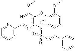 | 合成路线图解说明: The known dichloropyrimidine derivative (I) was condensed with 2-phenylethenesulfonamide (II) in the presence of NaH in DMF to furnish the N-pyrimidinylsulfonamide (III). Displacement of the remaining chlorine of (III) by means of methanolic NaOMe provided the corresponding methyl ether (IV). The title potassium salt was then prepared by treatment of sulfonamide (IV) with ethanolic KOH. |