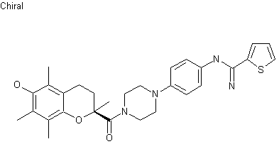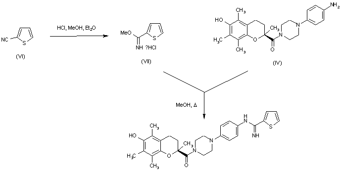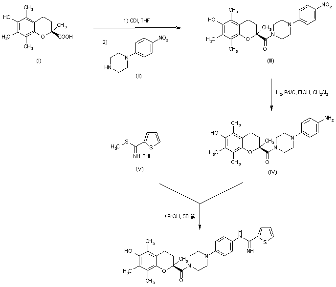 (S)-6-Hydroxy-2,5,7,8-tetramethylchroman-2-carboxylic acid (I) was coupled to N-(4-nitrophenyl)piperazine (II) via activation with 1,1'-carbonyldiimidazole to furnish the corresponding amide (III). Subsequent hydrogenation of the nitro group of (III) over Pd/C provided aniline (IV). This was finally condensed with S-methyl-2-thiophenethiocarboxamide (V) to yield the title amidine.