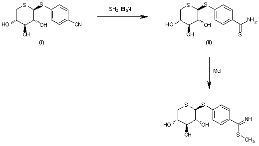 The reaction of Beciparcil (I) with H2S and triethylamine in pyridine gives the thiobenzamide (II), which is finally methylated with methyl iodide in refluxing acetone.