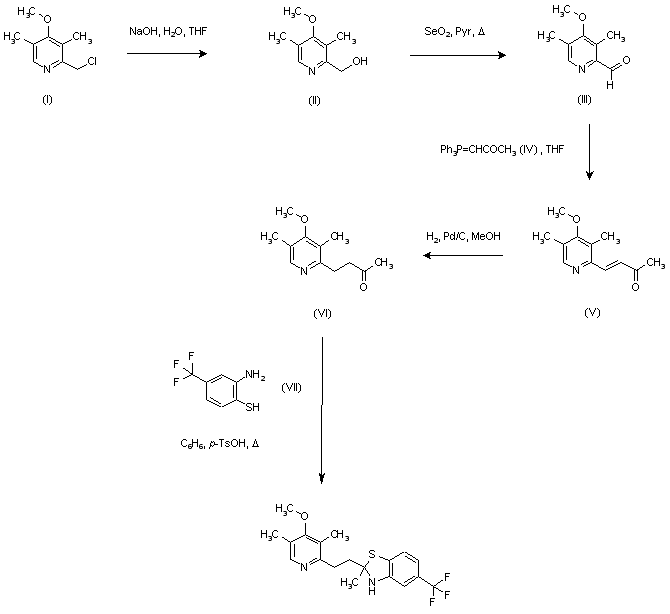 Reaction of chloromethylpyridine (I) with NaOH in aqueous THF afforded alcohol (II), which was oxidized to formylpyridine (III) with selenium dioxide in refluxing pyridine. Subsequent condensation of aldehyde (III) with phosphorane (IV) in THF provided enone (V), and this was hydrogenated in the presence of Pd/C in MeOH to give (VI). Finally, condensation of ketone (VI) with aminothiophenol (VII) in the presence of p-toluenesulfonic acid in refluxing benzene yielded the corresponding benzothiazolidine.