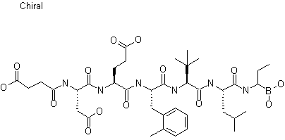 Hydrogenolysis of the benzyl ester of (XIII) over Pd/C gave peptide acid (XIV), which was converted to the mixed anhydride (XV) using isobutyl chloroformate and N-methylmorpholine. (Aminobutenyl)- dioxaborolane (XIX) was obtained by treatment of the (dichloromethyl)dioxaborolane (XVI) with allylmagnesium bromide (XVII), and subsequent displacement of the remaining chlorine atom with lithium bis(trimethylsilyl)amide. Condensation of anhydride (XV) with racemic aminoborolane (XIX) produced (XX) as a diastereomeric mixture. Finally, removal of the tert-butyl esters and hydrolysis of the dioxaborolane to the target boronic acid was effected with trifluoroacetic acid in CH2Cl2.