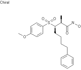 The reaction of 5-phenylpentanal (I) with triethyl 2-phosphonopropionate (II) by means of NaOEt in THF gives ethyl 2-methyl-7-phenyl-2(E)-heptenoate (III), which is hydrolyzed with NaOH in methanol/water to the corresponding free acid (IV). The reaction of (IV) with 4-methoxythiophenol (V) in hot piperidine affords 3-(4-methoxyphenylsulfanyl)-2-methyl-7-phenylheptanoic acid (VI), which by reaction first with oxalyl chloride, then with O-trimethylsilylhydroxylamine (VII) in dichloromethane, and finally with HCl is converted into the hydroxamic acid (VIII). Finally, this compound is oxidized with oxone in methanol/water to provide the target compound as mixture of diastereomeric racemates that is separated by reversed phase HPLC.