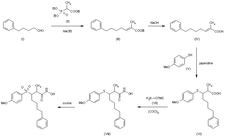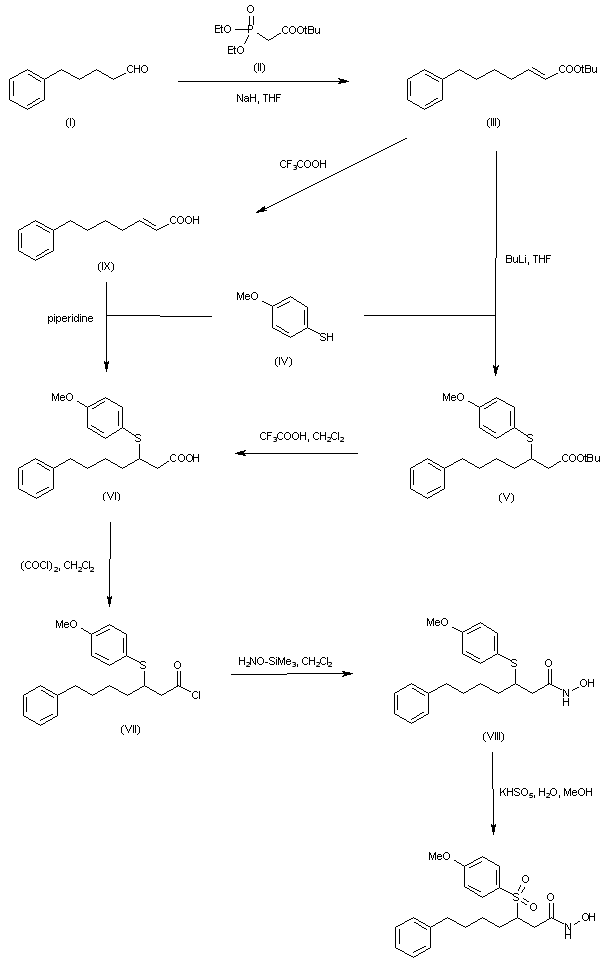 Horner-Emmons condensation of 5-phenylpentanal (I) with phosphonate (II) in the presence of NaH yielded tert-butyl 7-phenyl-2-heptenoate (III). Subsequent Michael addition of 4-methoxythiophenol (IV) to (III) using a catalytic amount of BuLi provided thioether (V). After acid deprotection of the tert-butyl ester of (V) with TFA, the resulting carboxylic acid (VI) was converted to acid chloride (VII) and then condensed with O-(trimethylsilyl)hydroxylamine to produce hydroxamic acid (VIII). Finally, sulfide oxidation of (VIII) with Oxone furnished the target beta-sulfonylhydroxamic acid. Alternatively tet-butyl ester (III) can be hydrolyzed first to the free acid (IX) with TFA, and then condensed with thiophenol (IV) by means of piperidine to afford the previously described carboxylic acid (VI).