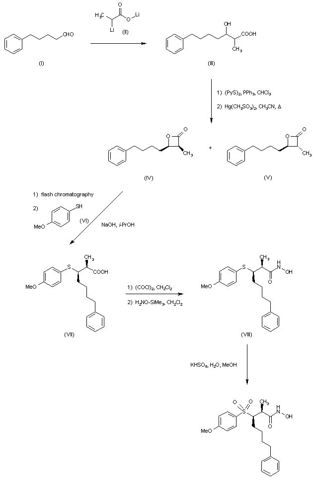 Hydroxyacid (III) was prepared by condensation of 5-phenylpentanal (I) with the dilithium anion of propionic acid (II). Cyclization of (III) upon treatment with dipyridyl disulfide and PPh3, and then with mercuric mesylate yielded an equimolar mixture of beta-lactones (IV) and (V), from which the desired cis isomer (IV) was isolated by flash chromatography. Subsequent ring opening of (IV) with the sodium salt of 4-methoxythiophenol (VI) provided carboxylic acid (VII). This was converted to acid the corresponding chloride by means of oxalyl chloride and then condensed with O-(trimethylsilyl)hydroxylamine to produce hydroxamic acid (VIII). Finally, sulfide oxidation of (VIII) with Oxone furnished the target sulfonylhydroxamic acid.