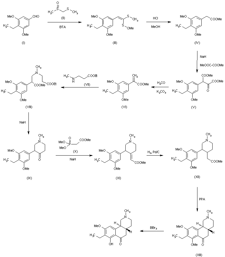 The reaction of benzaldehyde (I) with the sulfoxide (II) by means of benzyltrimethylammonium hydroxide in methanol gives the styrene derivative (III), which is hydrolyzed with HCl in methanol to the phenylacetate (IV). The condensation of (IV) with dimethyl oxalate by means of NaH in THF yields the succinate (V), which by reaction with formaldehyde and K2CO3 is converted into the acrylate (VI). The condensation of (VI) with ethyl 3-(methylamino)propionate gives intermediate (VII), which is cyclized by means of NaH in refluxing toluene yielding the piperidinone (IX). The condensation of (IX) with trimethyl phosphonoacetate (X) by means of NaH in THF affords the expected piperidinyleneacetate (XI), which is reduced with H2 over Pd/C in methanol giving the piperidinylacetate (XII). The cyclization of (XII) by means of polyphosphoric acid (PPA) in refluxing toluene yields the benzoisoquinoline (XIII), which is finally selectively demethylated with BBr3 in methylene chloride to the target compound.
