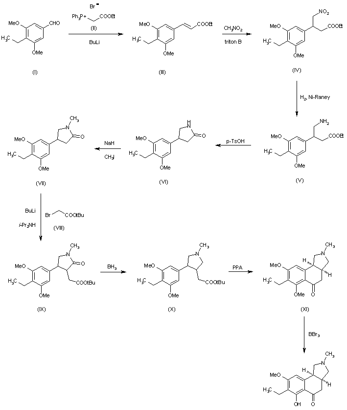 The reaction of 4-ethyl-3,5-dimethoxybenzaldehyde (I) with (ethoxycarbonylmethyl)triphenylphosphonium bromide (II) by means o butyllithium in THF gives the acrylate (III), which is allowed to react with nitromethane/triton B in hot methanol yielding the 4-nitrobutyrate (IV). The reduction of (IV) with H2 over RaNi in ethanol affords the 4-aminobutyrate (V), which is cyclized to the pyrrolidinone (VI) by means of p-toluenesulfonic acid in refluxing ethanol. The methylation of (VI) with NaH/methyl iodide in THF gives the corresponding N-methylpyrrolidinone (VII), which is condensed with tert-butyl bromoacetate (VIII) by means of butyllithium/diisopropylamine in THF yielding the intermediate (IX). The reduction of the ketonic grupof (IX) with the complex borane/THF in THF affords the pyrrolidineacetate ester (X), which is cyclized by means of polyphosphoric acid (PPA) at 120 C giving the benzisoindole (XI). Finally, this compound is selectively demethylate by menas of BBr3 in dichloromethane.
