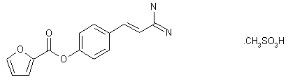 The reaction of 4-hydroxybenzaldehyde (I) with cyanacetic acid (II) by means of pyridine in toluene gives the 3-(4-hydroxyphenyl)propenenitrile (III), which by reaction first with methanolic HCl and then with methanolic ammonia is converted into the amidine (IV). Finally, this compound is condensed with 2-furylcarbonyl chloride (V) in pyridine and treated with methanesulfonic acid to afford the target sulfonate.