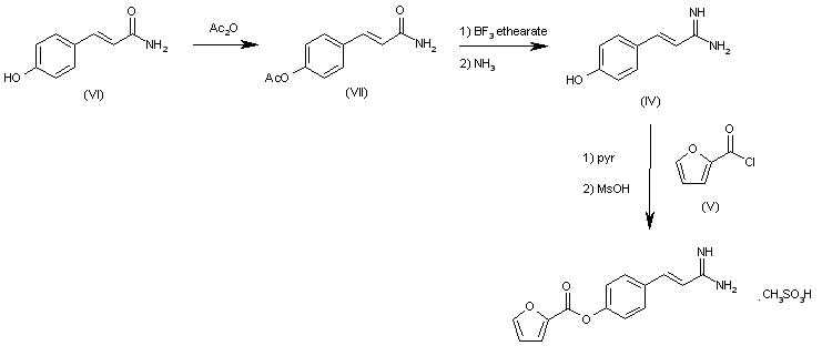 The acylation of (E)-3-(4-hydroxyphenyl)-2-propenamide (VI) with acetic anhydride gives the 4[(E)-3-amino-3-oxo-1-propenyl]phenyl acetate (VII), which by reaction first with BF3 ethearate and then with ammonia is converted into the amidine (IV). Finally, this compound is condensed with 2-furylcarbonyl chloride (V) in pyridine and treated with methanesulfonic acid to afford the target sulfonate.