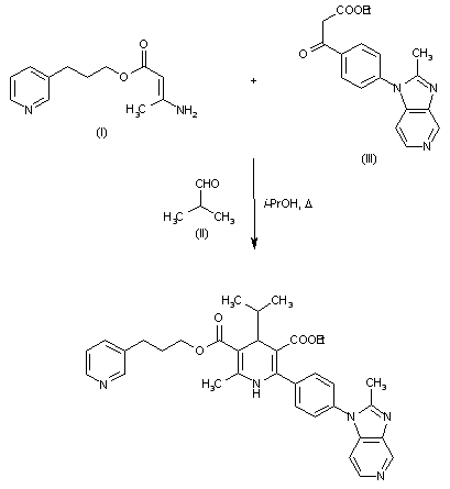 The title dihydropyridine was prepared by Hantzsch synthesis by condensation of aminocrotonate ester (I), isobutyraldehyde (II) and keto ester (III) in boiling isopropanol.