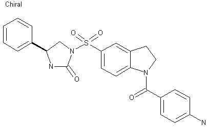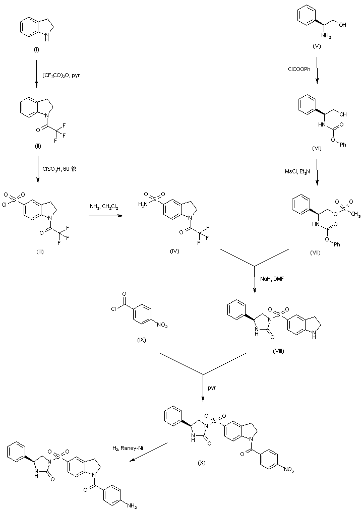 Protection of indoline (I) using trifluoroacetic anhydride provided N-trifluoroacetylindoline (II), which was sulfonated with chlorosulfonic acid to give sulfonyl chloride (III). Further treatment with ammonia in CH2Cl2 produced sulfonamide (IV). Phenylglycinol (V) was condensed with phenyl chloroformate to afford carbamate (VI). Subsequent reaction of (VI) with metanesulfonyl chloride and triethylamine yielded mesylate (VII). The condensation of sulfonamide (IV) with mesylate (VII), with concomitant cyclization of carbamate group and trifluoroacetyl deprotection, furnished imidazolone (VIII). This was further condensed with 4-nitrobenzoyl chloride (IX), and the resulting 4-nitrobenzamide (X) was finally reduced to the target aminobenzamide by hydrogenation over Raney Nickel.